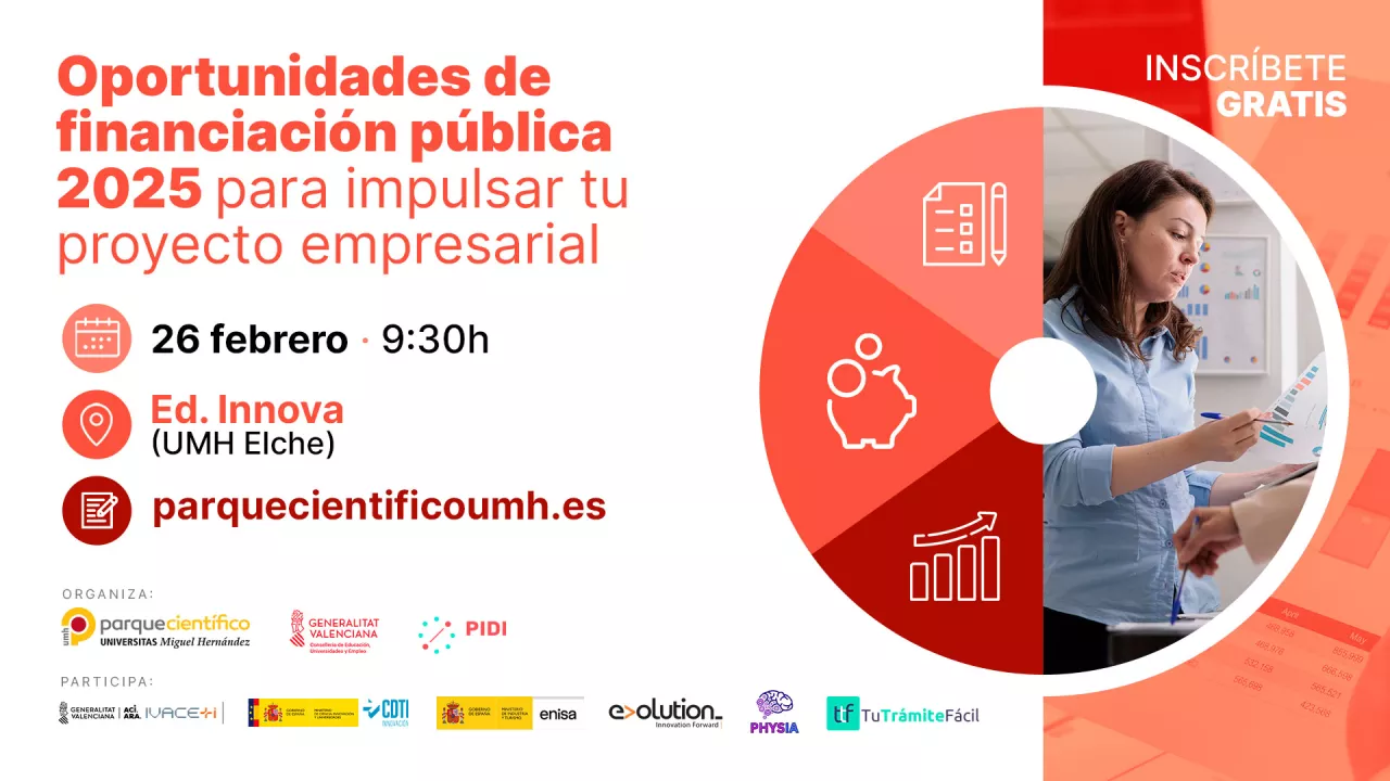 El objetivo de la jornada es ofrecer una visión integral sobre las oportunidades de financiación pública para proyectos de I+D+i en 2025, abordando tanto programas autonómicos como nacionales y europeos. A través de ponencias especializadas, se presentarán las principales líneas de ayuda de IVACE+i, CDTI y ENISA, así como programas europeos clave, proporcionando a empresas y emprendedores las herramientas necesarias para optimizar la presentación y gestión de sus solicitudes. Durante la jornada también se presentarán dos casos de éxito de empresas del Parque Científico de la UMH.